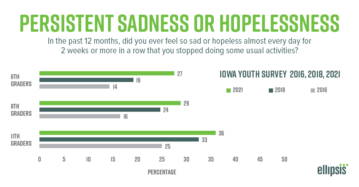 In 2021, 27% of Iowa’s sixth graders reported feeling persistent sadness and hopelessness for two weeks or more that prevented them from carrying out typical activities, up from the 14% who reported this issue in 2016. Even more of Iowa Iowa’s high school juniors, 36% in 2021, reported the same experience, which is up from the 25% who reported that feeling in 2016.